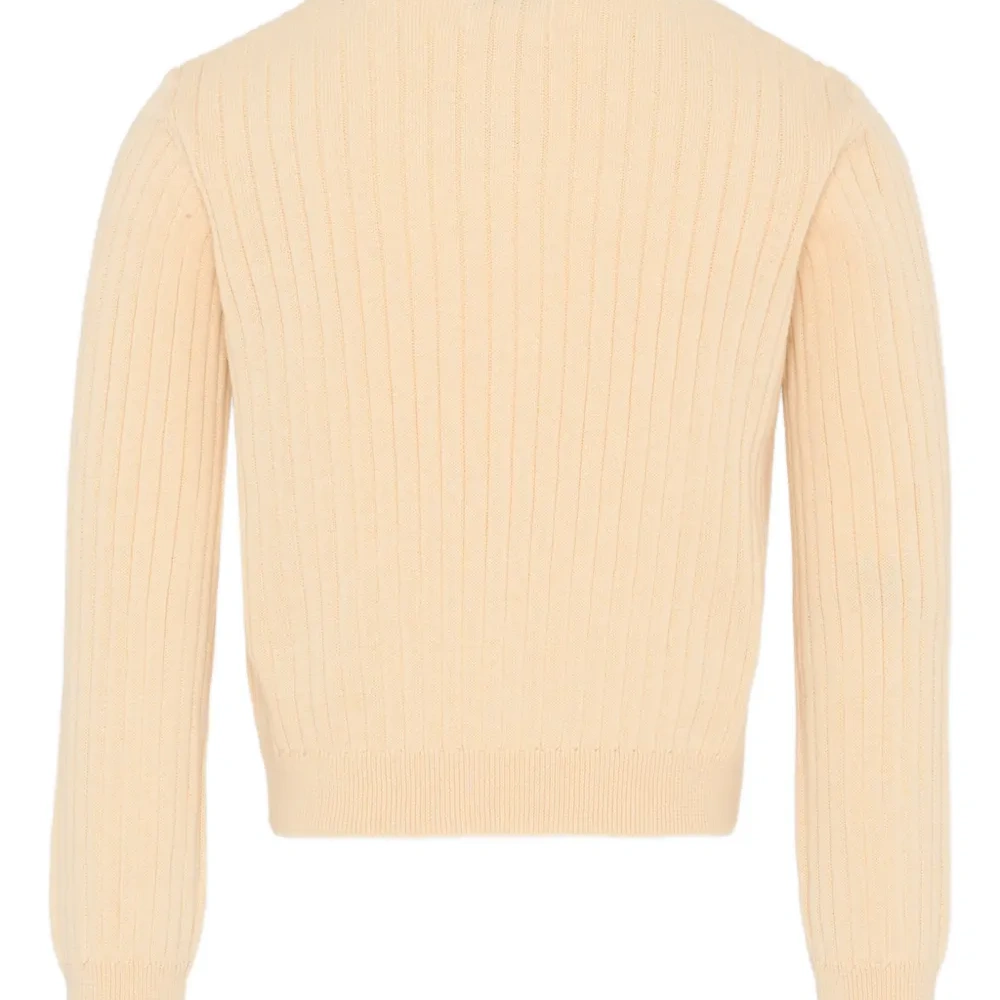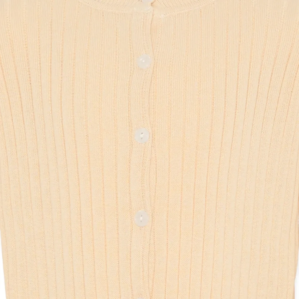 бежевый вязаный в рубчик кардиган на пуговицах, круглый вырез, длинные рукава, прямой край