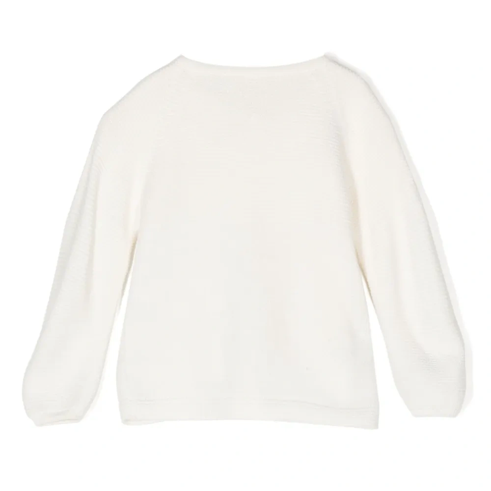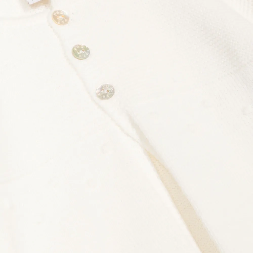 Кремовый, трикотажный материал, круглый вырез, длинные рукава, застежка на пуговицах спереди и прямой подол.