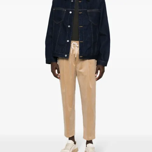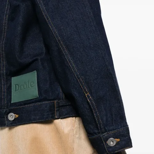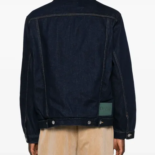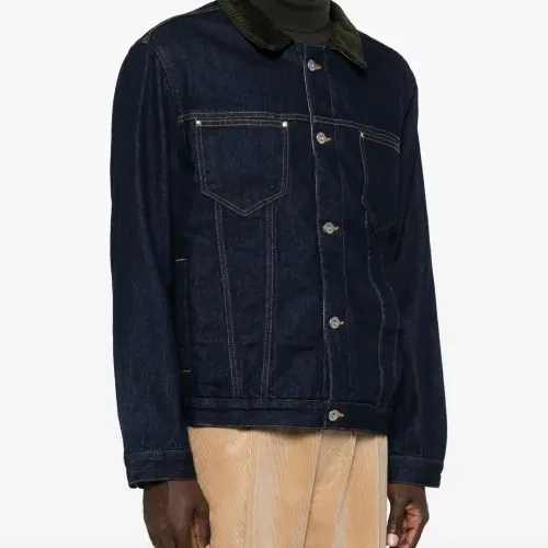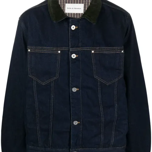 Темно-синий, хлопок, деним, темный оттенок денима, воротник из овечьей шерсти, застежка на пуговицах спереди, два накладных кармана на груди, нашивка с логотипом сзади, длинные рукава, манжеты на пуговицах, прямой подол и подкладка из хлопка.