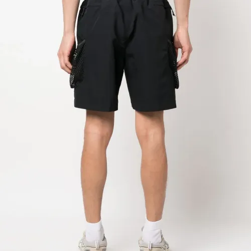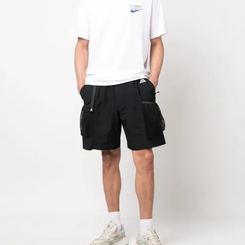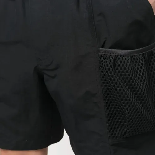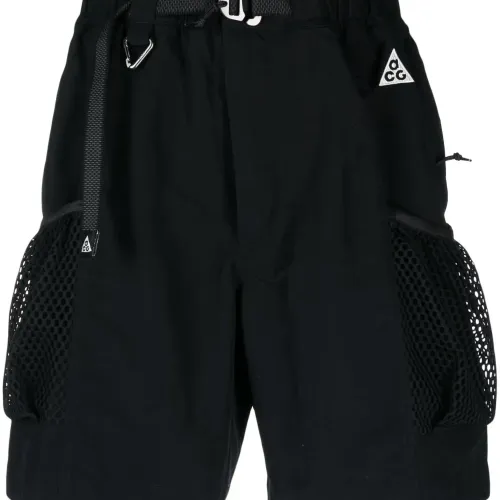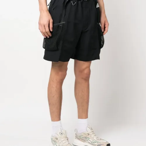 Черный, логотип спереди, эластичный пояс, прорезные карманы по бокам, сетчатый карман сзади, вышитый логотип сзади, два кармана с листочкой сзади и длина выше колена.