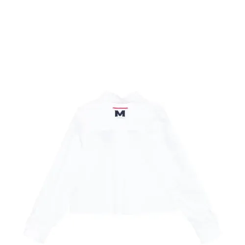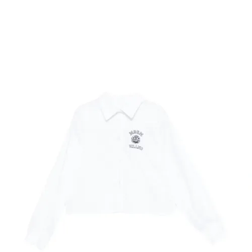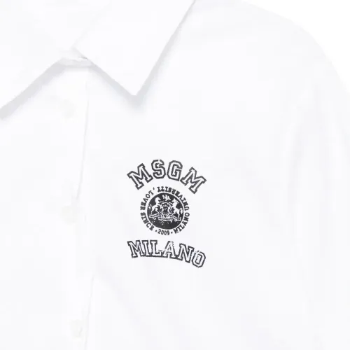 белый укороченный топ с воротником, застёжкой на пуговицы и длинными рукавами