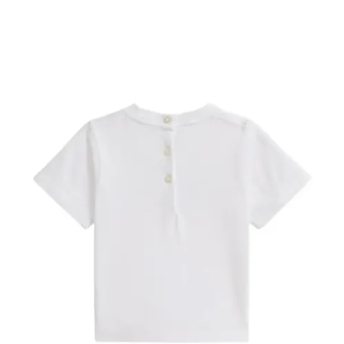 белая футболка с графическим принтом, застежкой на пуговицы, короткими рукавами и круглым вырезом