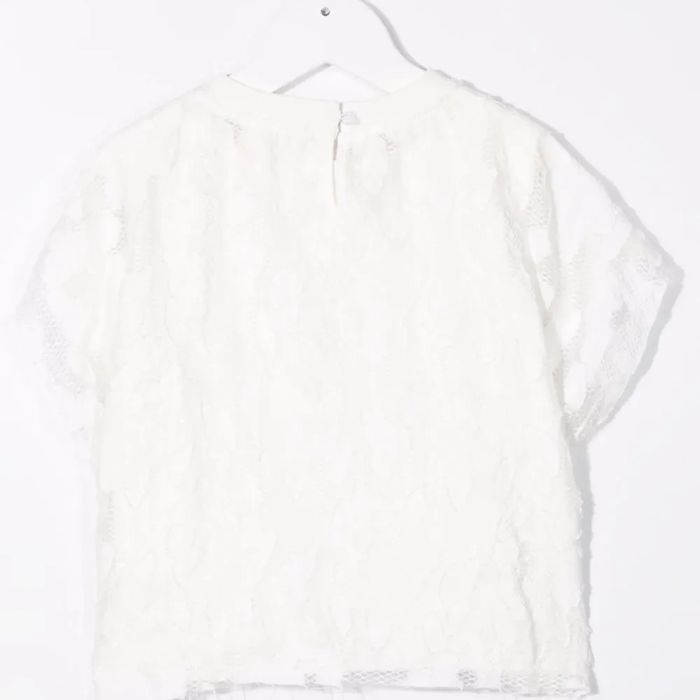 Вставки из цветочного кружева, круглый вырез, подкладка из мягкой ткани, короткие рукава и прямой подол. Цвет: белый. . Узнать больше о том, какие товары получают отметку «Ответственный выбор», можно из материала «Как мы оцениваем экологичность и этичность».