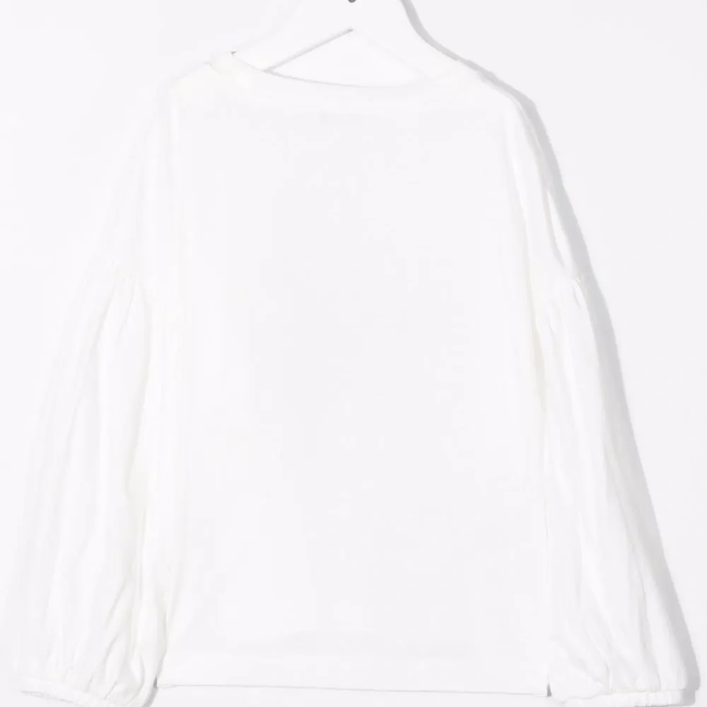 Принт на груди, круглый вырез, длинные рукава и прямой подол.