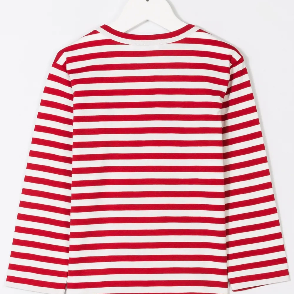 Красный хлопковый топ в бретонскую полоску с принтом сердца от COMME DES GARÇONS PLAY KIDS. Круглый вырез, длинные рукава, полосатый узор.