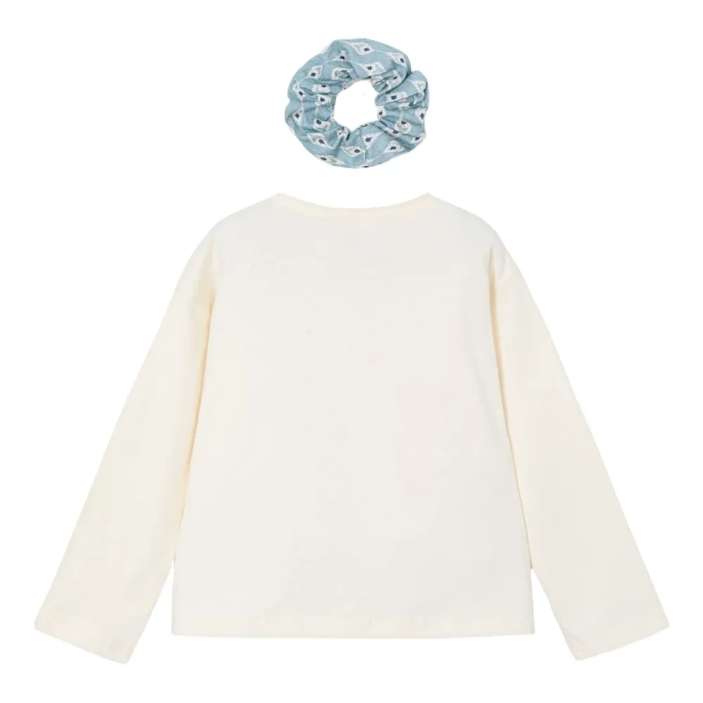 белый лонгслив с графическим принтом и круглым вырезом, в комплекте с подходящей резинкой для волос