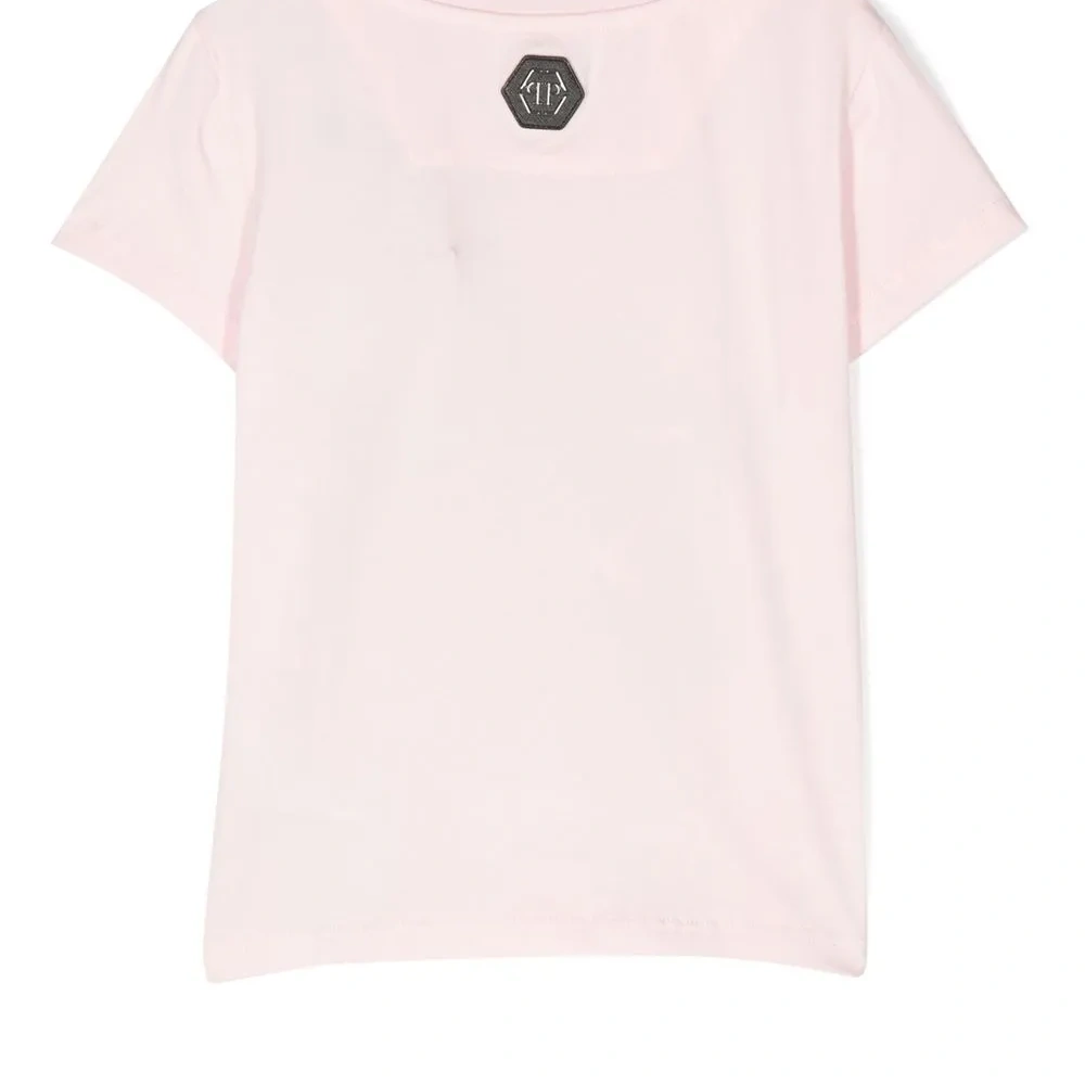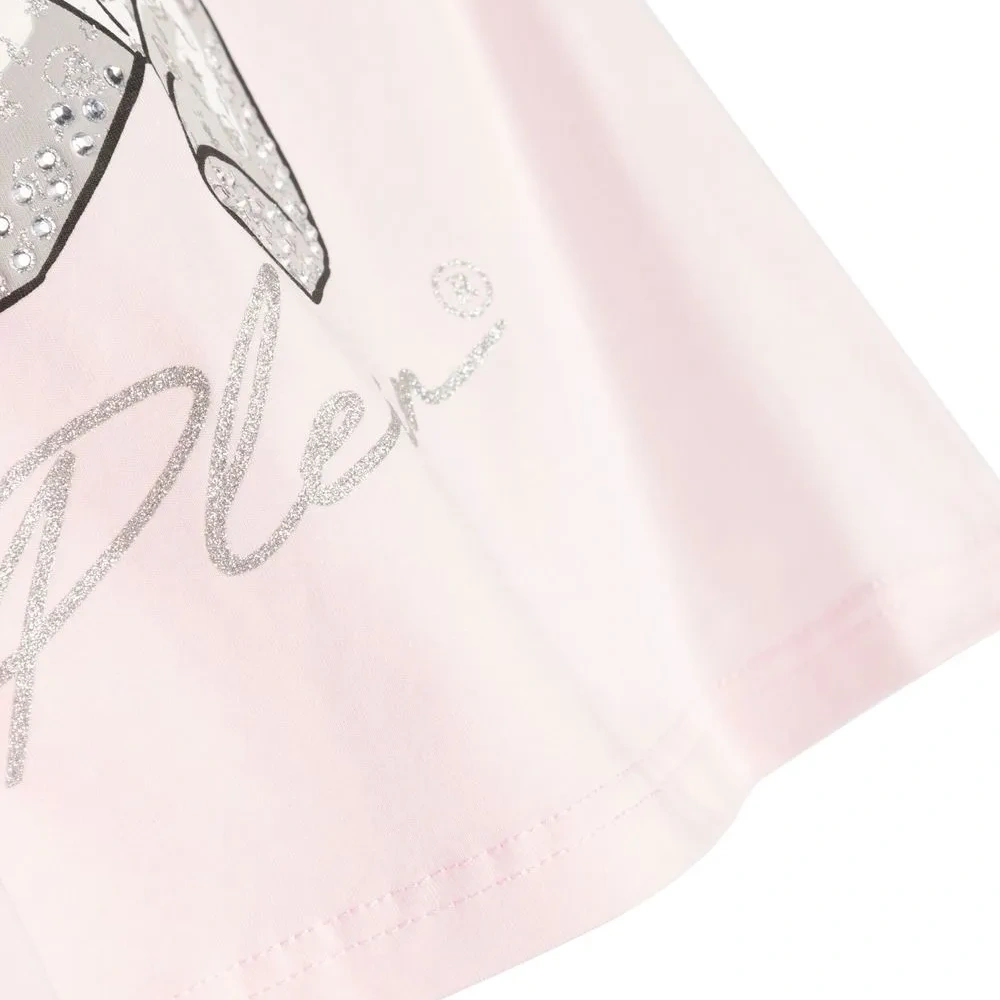 Светло-розовый, эластичный хлопок, ткань джерси, принт с изображением плюшевого медведя, декор из кристаллов, круглый вырез, короткие рукава и прямой подол.