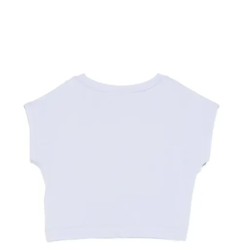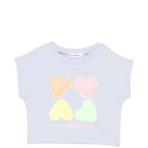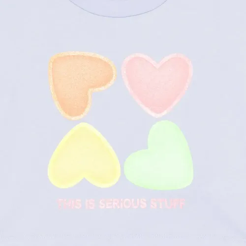 голубой укороченный топ с принтом в виде сердец, круглым вырезом, короткими рукавами и надписью