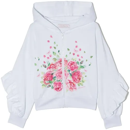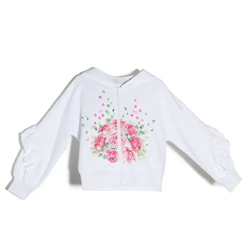 Принт с изображением роз спереди, вставки с оборками, застежка на молнии спереди, классический капюшон, длинные рукава, манжеты в рубчик и подол в рубчик. Цвет: белый.