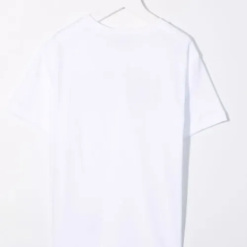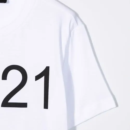 Принт с логотипом на груди, круглый вырез, короткие рукава и прямой подол.
