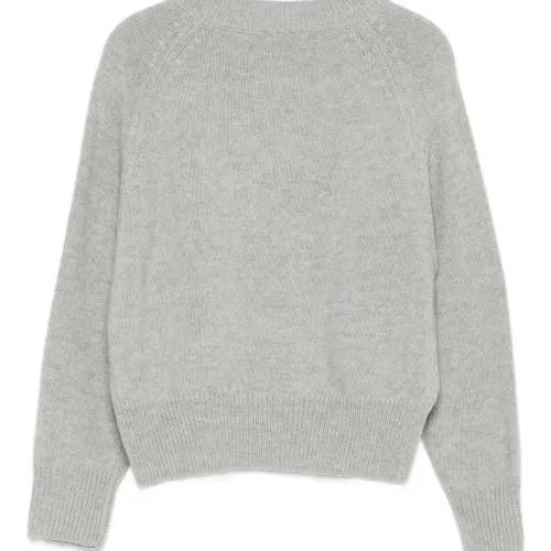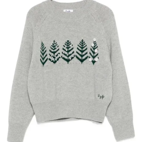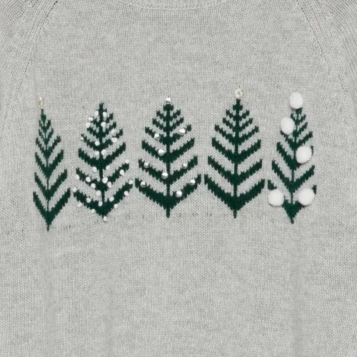 Серый джемпер с интарсией в виде дерева, круглым вырезом, длинными рукавами, ребристым подолом и манжетами.