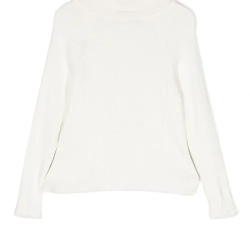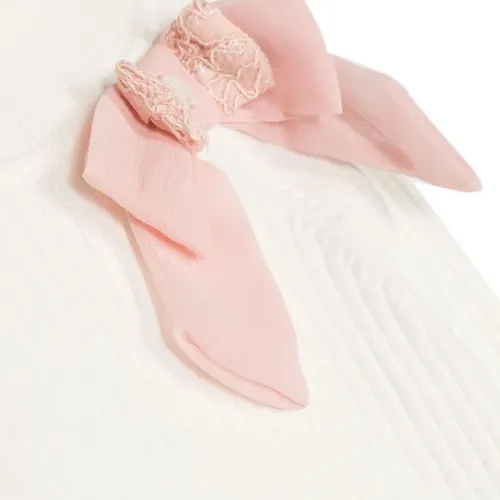 Кремово-белый, смесовый хлопок, трикотаж в рубчик, бант, высокий воротник и длинные рукава.