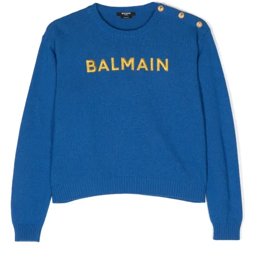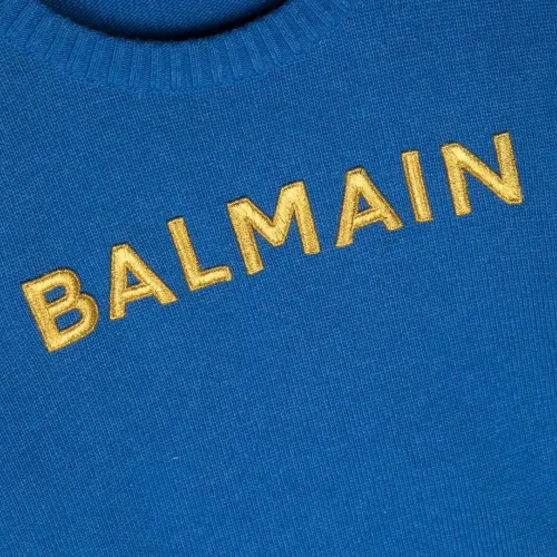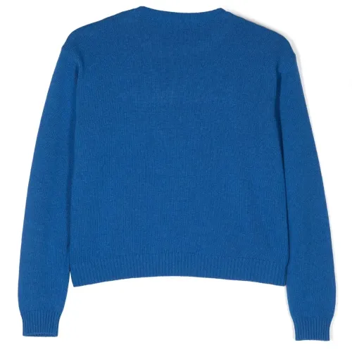 Кобальтово-синий, тонкая вязка, вязаные края в рубчик, вышитый логотип спереди, круглый вырез, пуговичные застежки на плечах, длинные рукава и прямой подол.