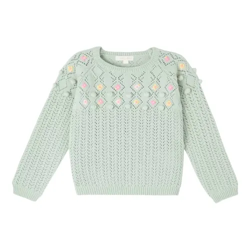 зеленый джемпер с вышивкой, открытой вязкой, круглым вырезом и длинными рукавами