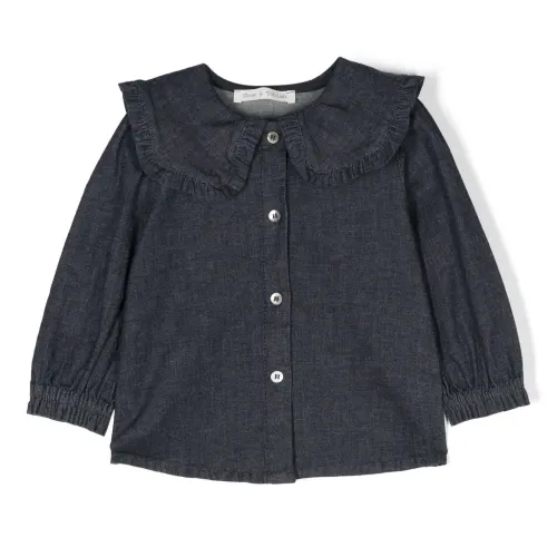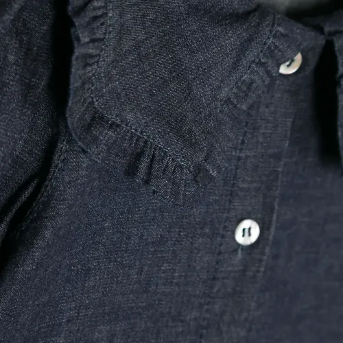 Темно-синий, эластичный хлопок, обработанный деним, отделка с оборками, закругленный воротник, застежка на пуговицах спереди, объемные рукава и прямой подол.