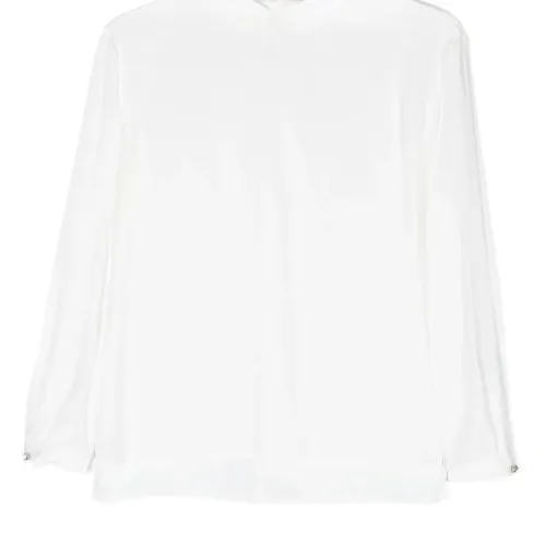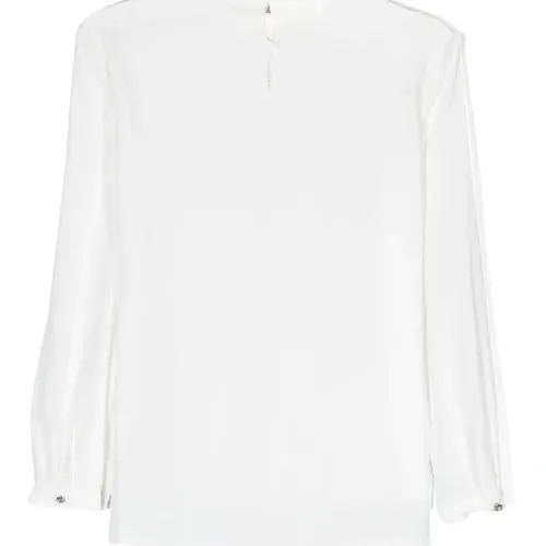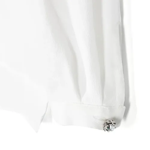 Цвет слоновой кости, воротник Питер Пэн, застежка на пуговицы сзади, широкие рукава, манжеты на пуговицах и прямой подол.