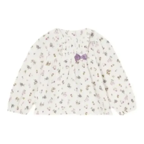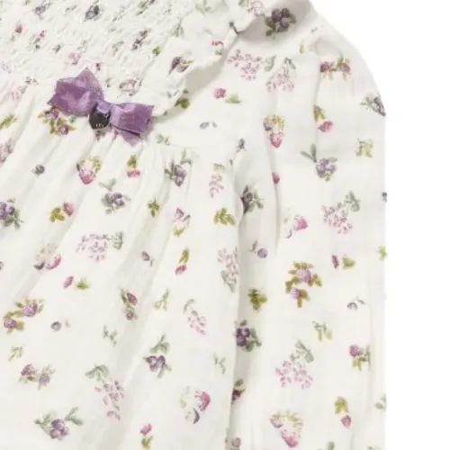белый топ с цветочным принтом, украшением в виде банта, сборками, длинными рукавами и квадратным вырезом