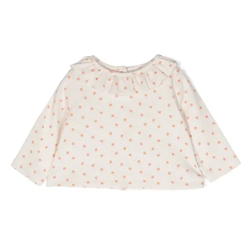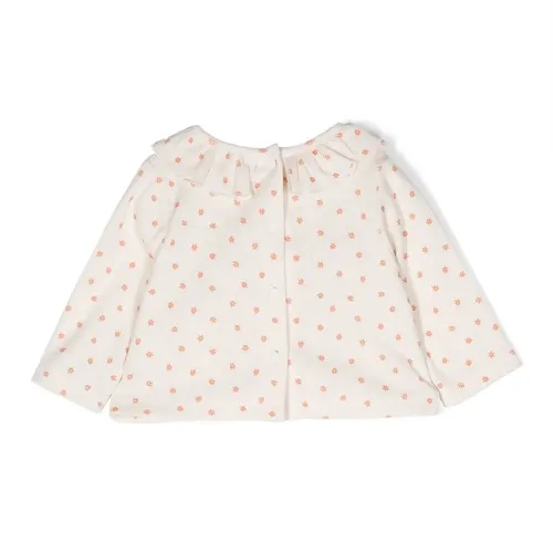 Бежевый, хлопок, сплошной цветочный принт, застежка на пуговицы сзади, воротник с оборками, длинные рукава и прямой подол.