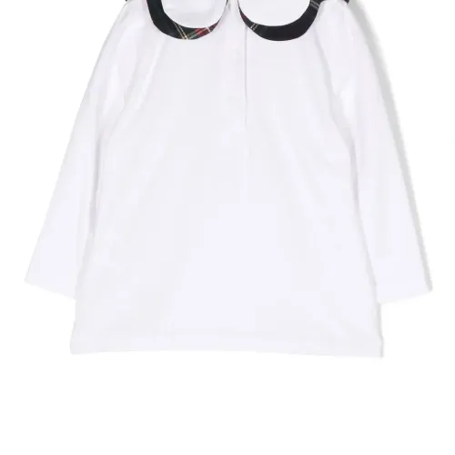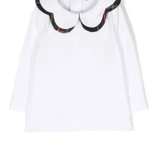 Белый, смесовый хлопок, принт в клетку тартан, манишка, застежка на кнопках сзади и длинные рукава.