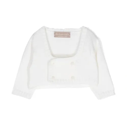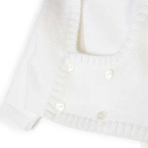 Трикотажный материал, отделка в рубчик, квадратный вырез и двубортная застежка на кнопки.