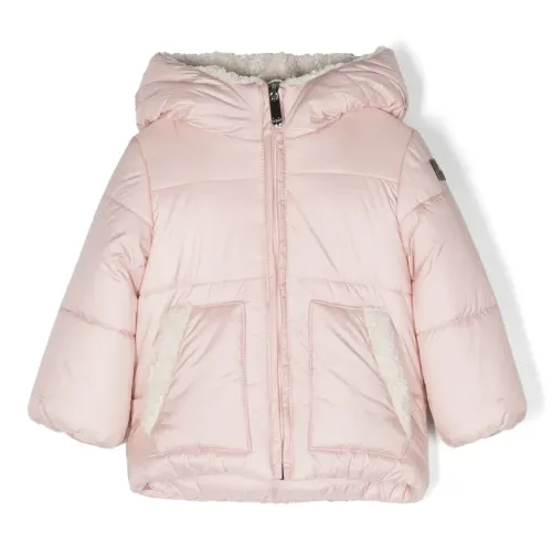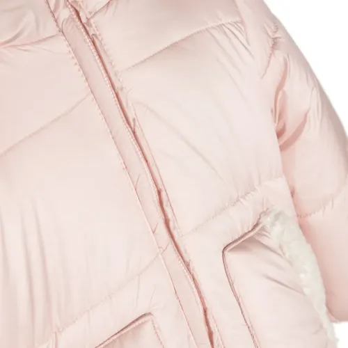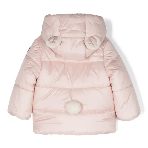 Пудрово-розовый, дутый материал, подкладка из шерпы, нашивка с логотипом сбоку, декоративные ушки на капюшоне, помпоны, классический капюшон, застежка на молнии спереди, длинные рукава, два накладных кармана по бокам и прямой подол.