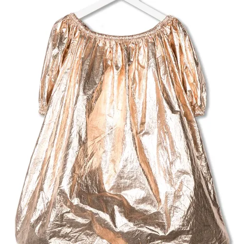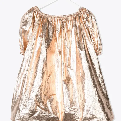 Платье с эффектом металлик от Andorine. Металлический отблеск, круглый вырез, короткие рукава и пышный подвернутый подол.