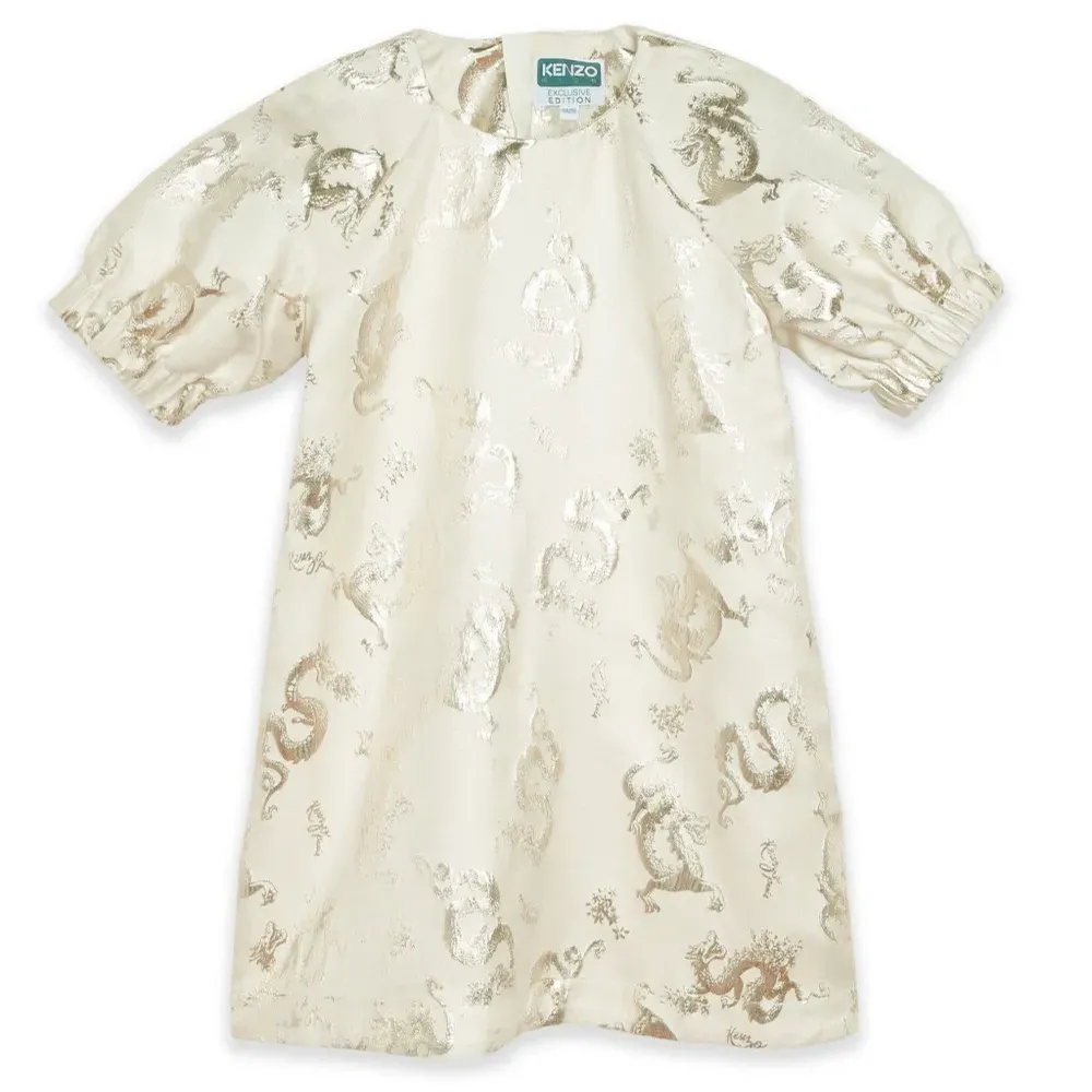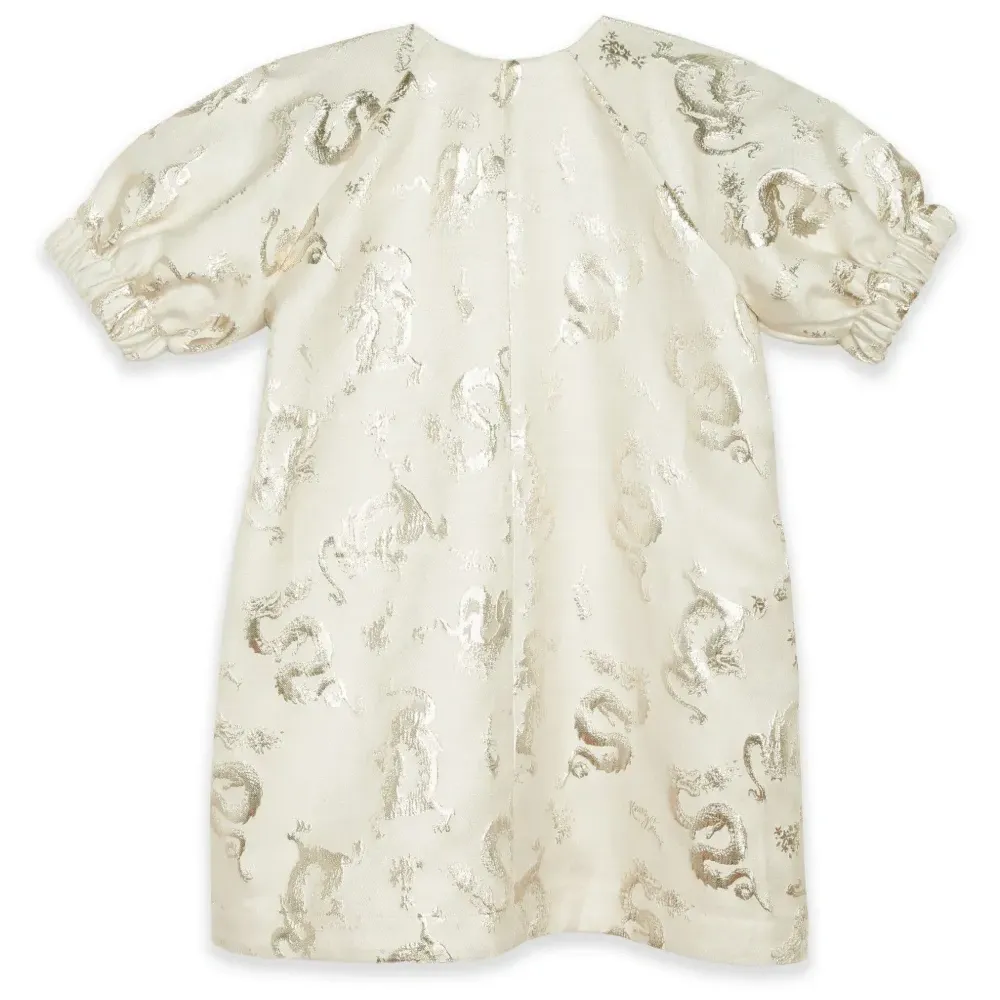Цвет слоновой кости, серебристый, вставки из люрекса, жаккардовый материал с узором, круглый вырез, короткие объемные рукава, эластичные манжеты, потайная застежка на молнии сзади и прямой подол.