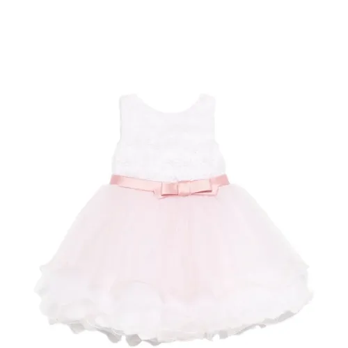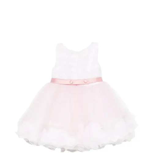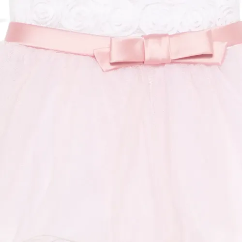 Розовая юбка А-силуэта без рукавов с цветочными деталями, съемным бантом и многослойной юбкой