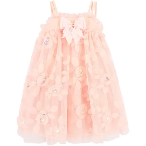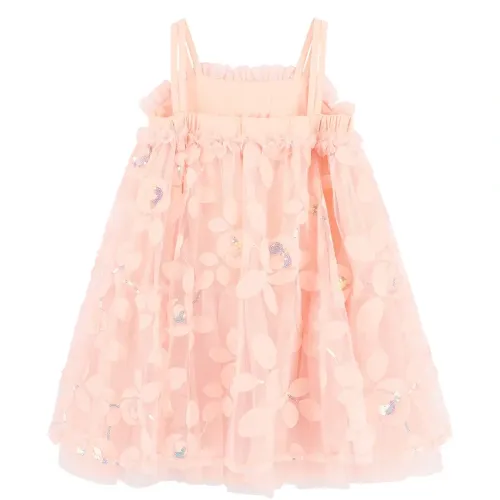 персиково-розовый цвет, украшения в виде цветов, оборчатые детали, многослойная юбка, бретели