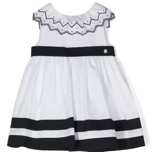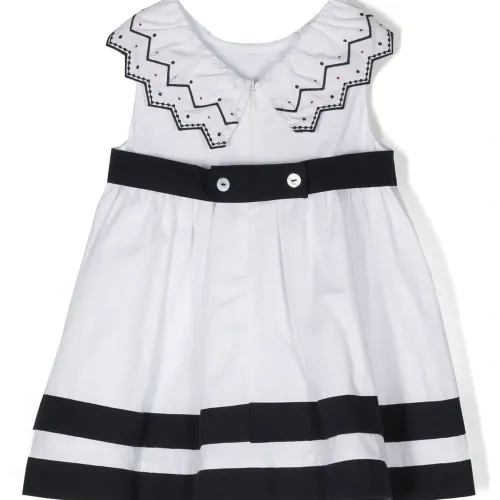 Зигзагообразная вышивка, дизайн со сборками, бант, застежка на молнии сзади, круглый вырез, без рукавов, пышная юбка и прямой подол.