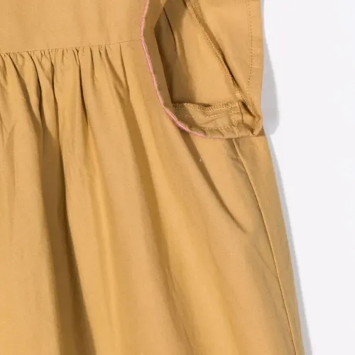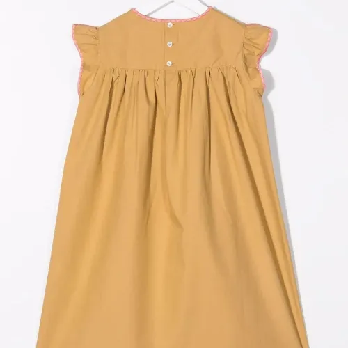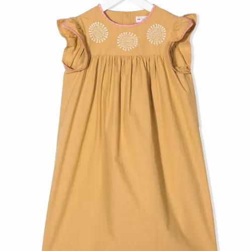 Вышивка, круглый вырез, отделка с оборками и сборка на талии.
