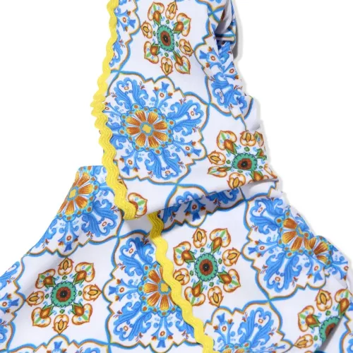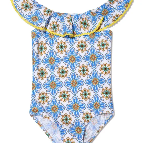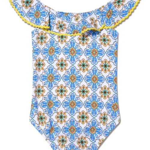 Лазурный, разноцветный, геометричный узор, вставки с оборками, контрастная отделка, защита от ультрафиолетового излучения, эластичный материал, открытые плечи и широкое горлышко. Пожалуйста, примеряйте купальники и пляжные шорты только поверх собственного белья.