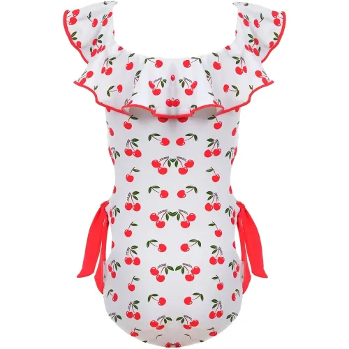 белый и красный купальник с вишнёвым принтом по всей поверхности, с оборками и завязками по бокам. Пожалуйста, примерьте купальник поверх своего нижнего белья.