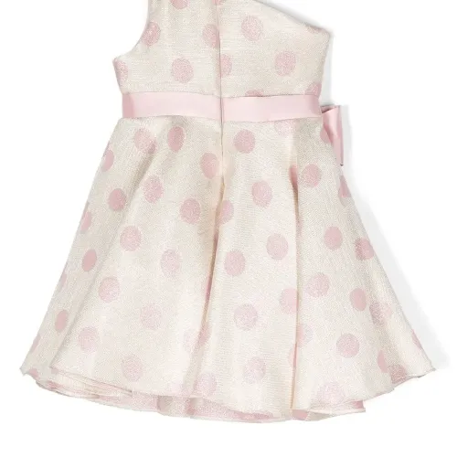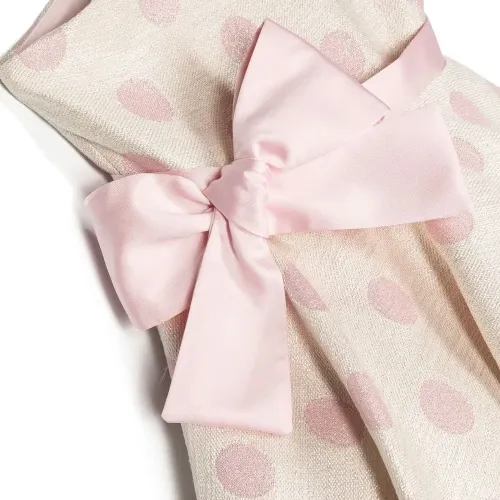 Песочно-бежевый, розовый, смесовый хлопок, вставки из люрекса, модель на одном плече, принт в горох, бант спереди, без рукавов и расклешенная юбка.
