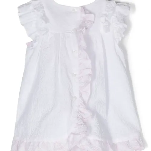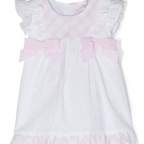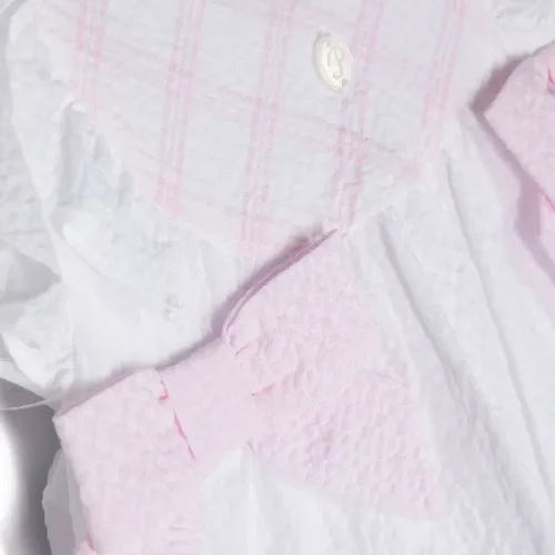 Белый, розовый, эластичный хлопок, сирсакер, принт в клетку, бант, вставки с оборками, подвеска с логотипом, подол с баской, застежка на пуговицы сзади, круглый вырез и без рукавов.