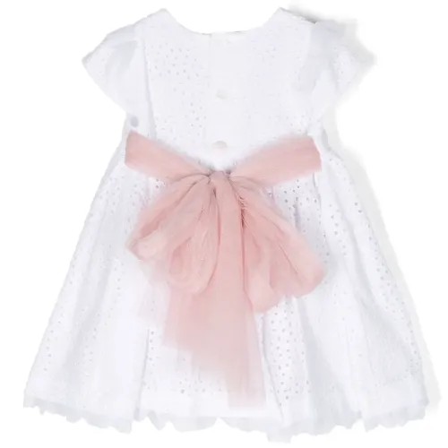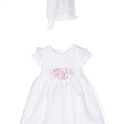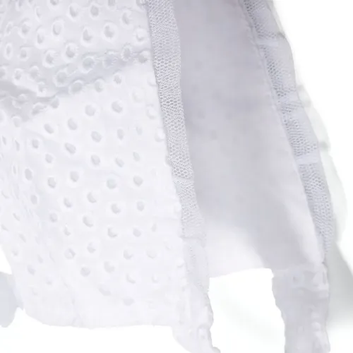 Расцветка Cloud White, вышивка, цветочная аппликация, круглый вырез, застежка на пуговицы сзади, короткие рукава, завязка на бант сзади, пышная юбка и волнистые края.