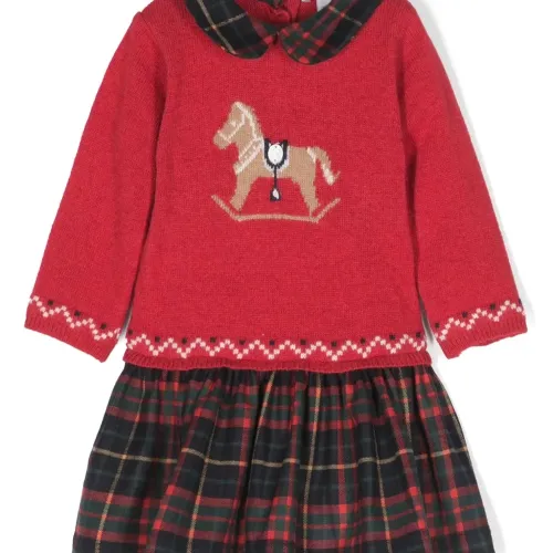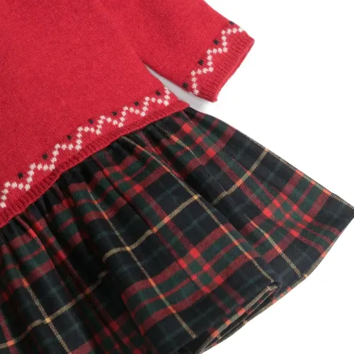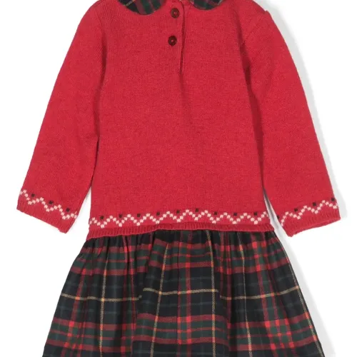 Многослойный дизайн, вязаные вставки, вязка в технике интарсия, узор в клетку тартан, воротник Питер Пэн, застежка на пуговицы сзади, длинные рукава и расклешенный подол.