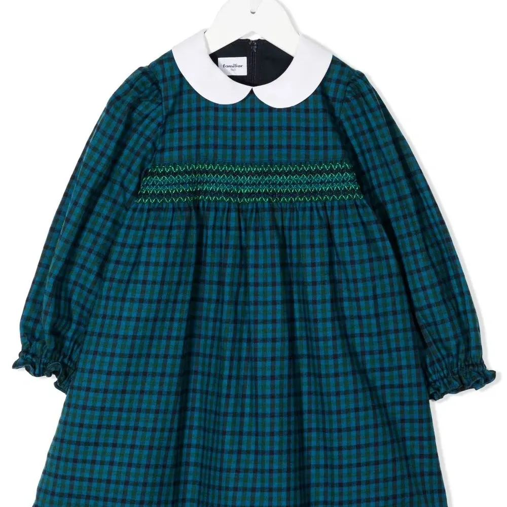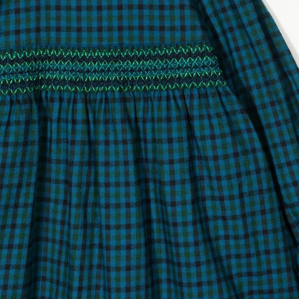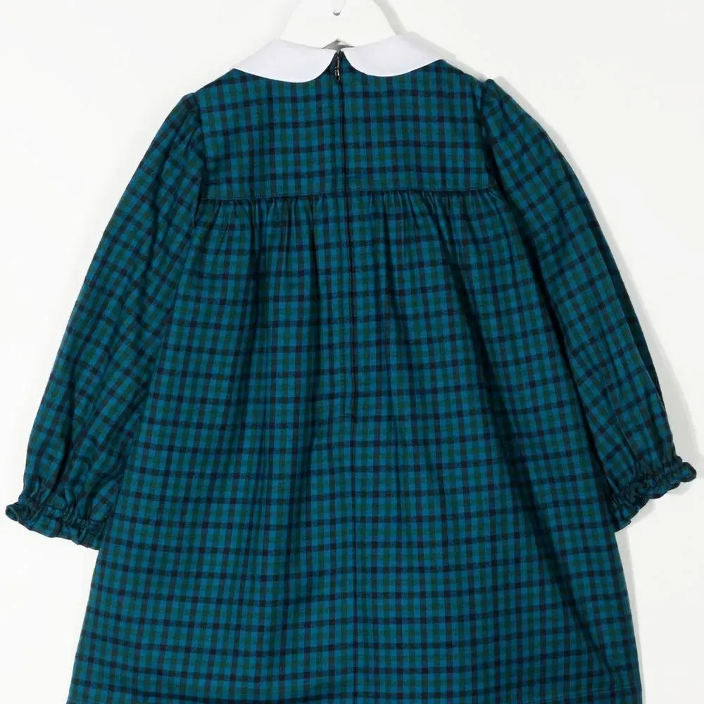 Темно-синий, смесовый хлопок, принт в клетку, вставка со сборками, воротник Питер Пэн, длинные рукава, застежка на молнии сзади, расклешенная юбка и прямой подол.