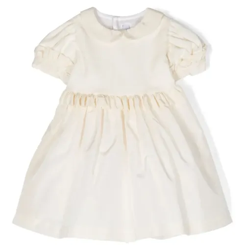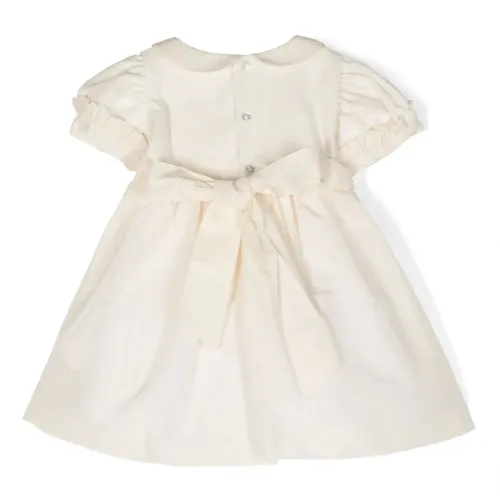 Кремово-белый, строчка в тон, бант, вставки с оборками, воротник Питер Пэн, застежка на пуговицы сзади, короткие рукава, приталенный силуэт, пышная юбка и прямой подол.