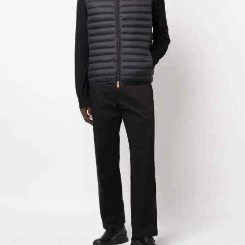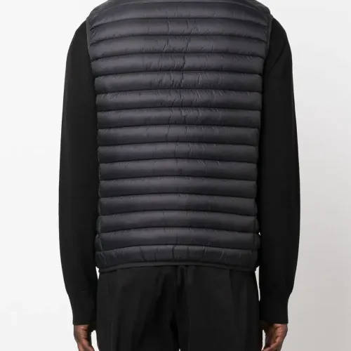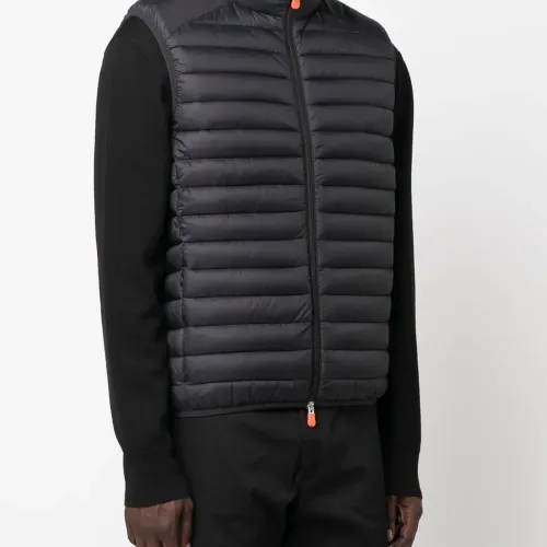 Черный, нашивка с логотипом сбоку, высокий воротник, застежка на молнии спереди, два кармана на молнии по бокам, без рукавов и прямой подол.