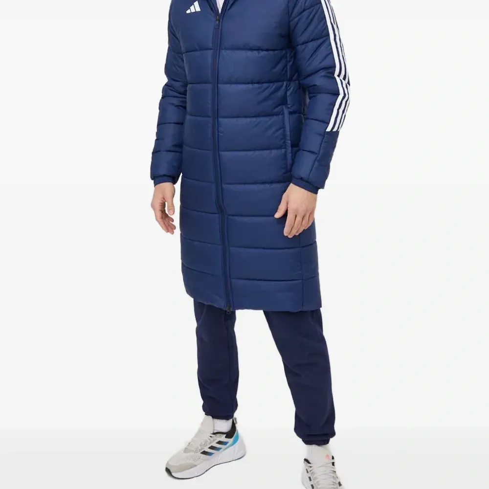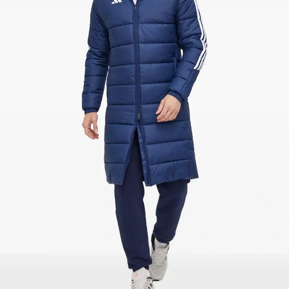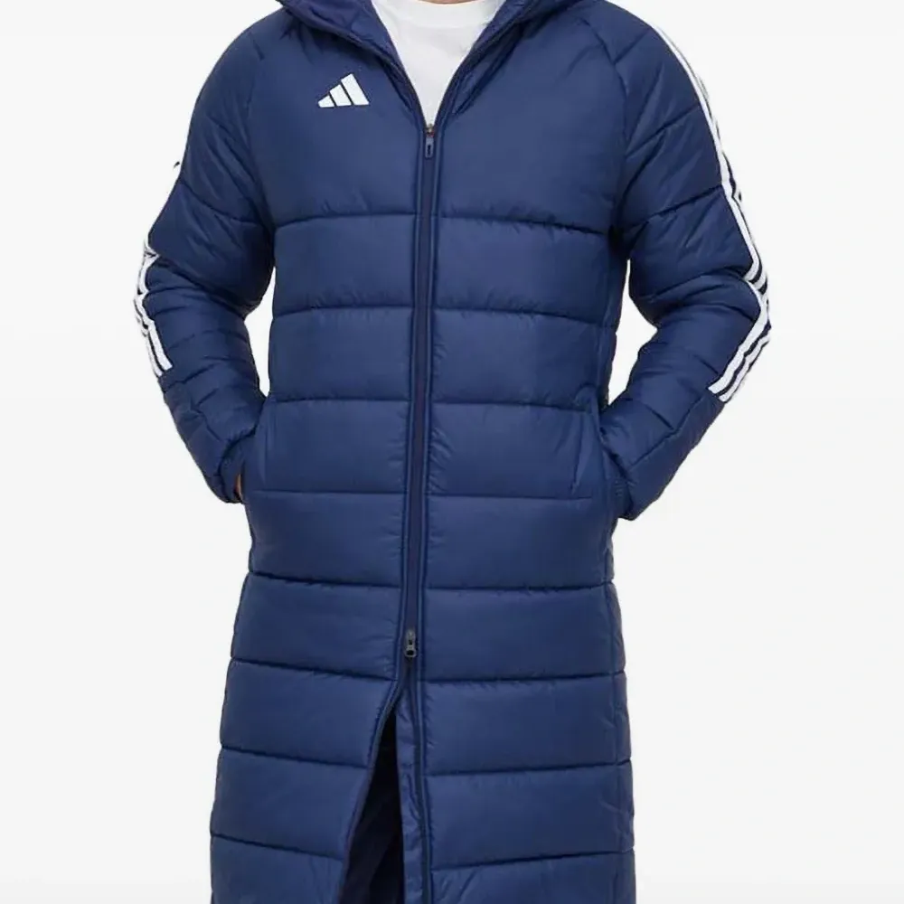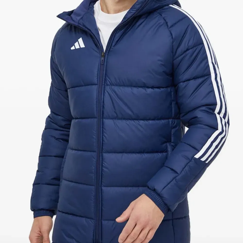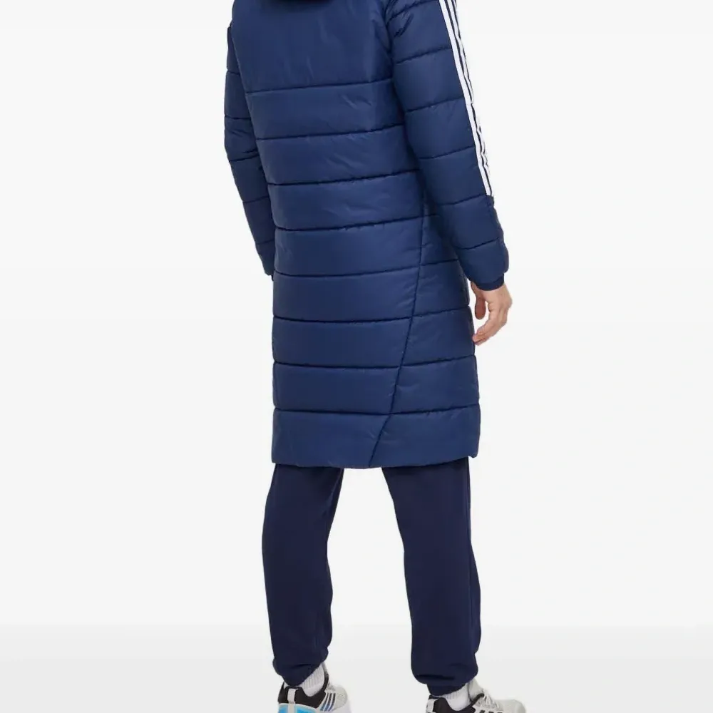 темно-синий цвет, стеганый дизайн, застежка-молния во всю длину, капюшон, фирменные три полоски, длинные рукава