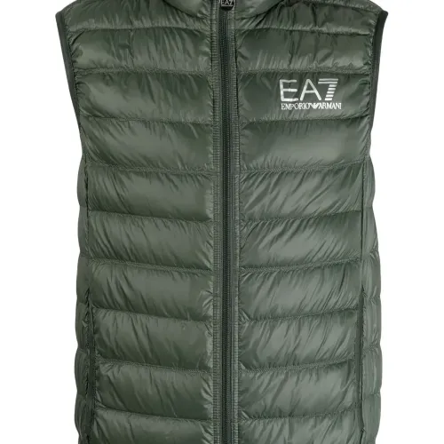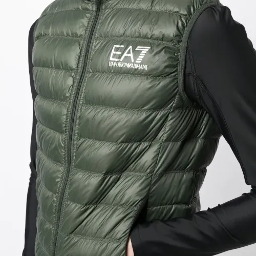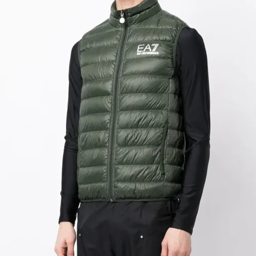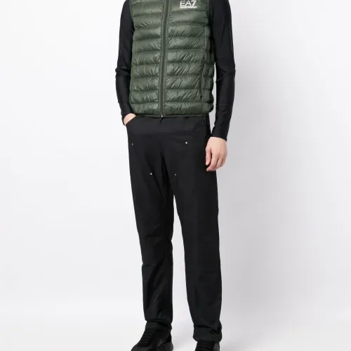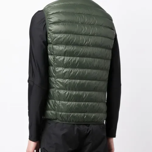 Зеленый, утиный пух, дутый материал, принт с логотипом на груди, воротник-труба, застежка на молнии спереди, без рукавов и два вшитых кармана по бокам.