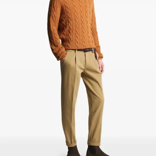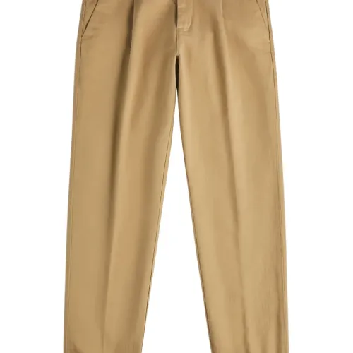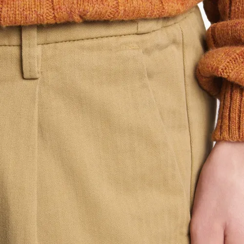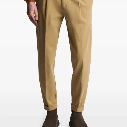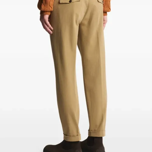 бежевые брюки с эластичным поясом, застегивающимися на пуговицу задними карманами и подворотами