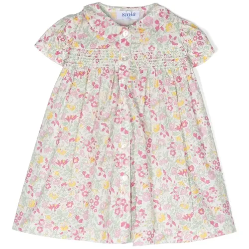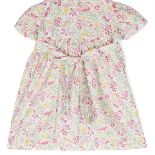 Белый/разноцветный, хлопок, сплошной цветочный принт, воротник Питер Пэн, застежка на пуговицах спереди, застежка на завязке сзади, короткие рукава и плиссированная юбка.