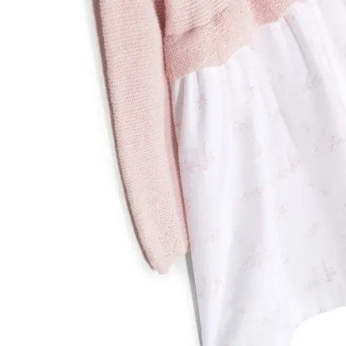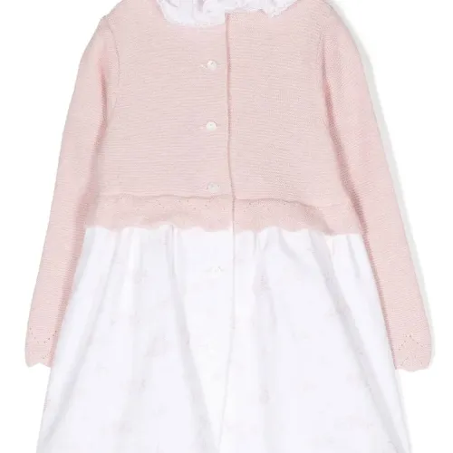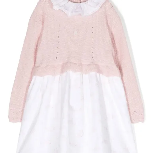 Белый, светло-розовый, хлопок, смесовая шерсть мериноса, воротник с оборками, длинные рукава, расклешенный крой и застежка на пуговицы сзади.