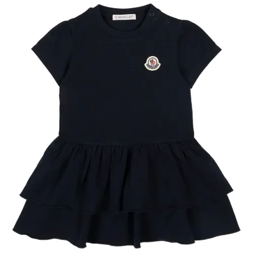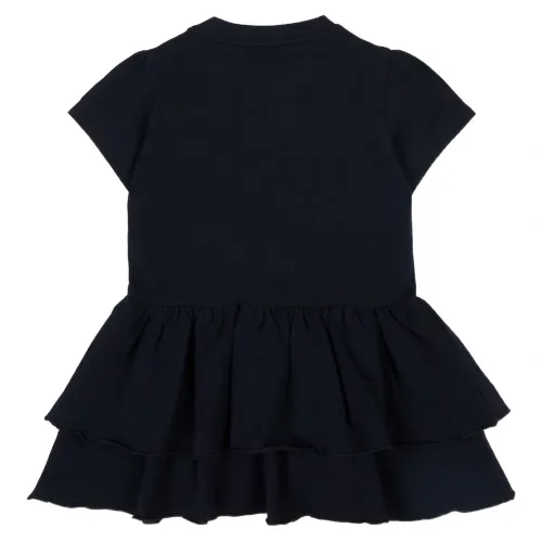 синее платье с круглым вырезом, короткими рукавами, нашивкой с логотипом и многоярусной юбкой