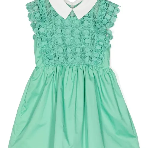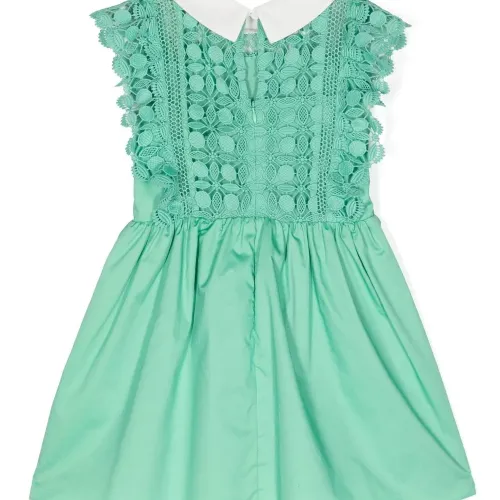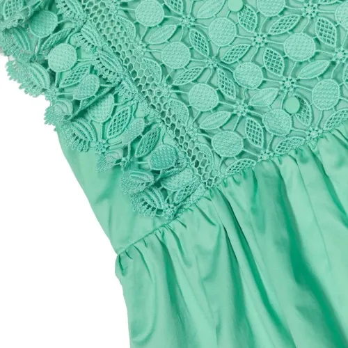 Светло-зеленый, хлопок, вставки из кружева с узором, детали с оборками, контрастный воротник, вырез сзади, без рукавов и прямой подол.