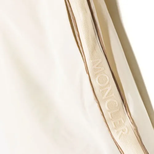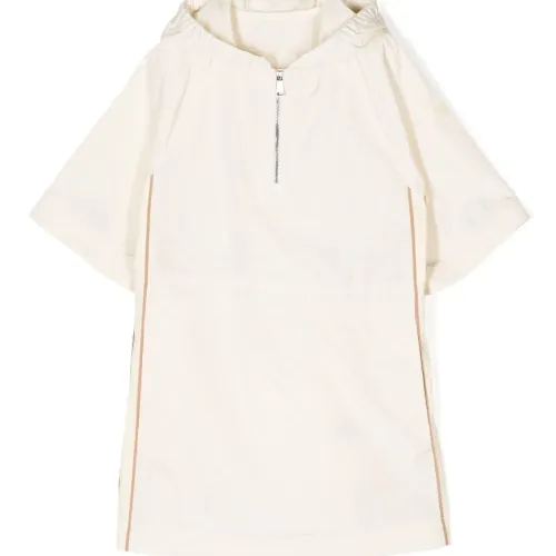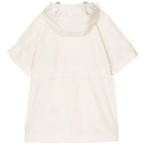 Светло-бежевый, классический капюшон, вставка из эластичной ленты, короткая застежка на молнии спереди, короткие рукава, кулиска на талии, полоска сбоку, тисненый логотип сбоку, два прорезных кармана по бокам и прямой подол.