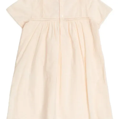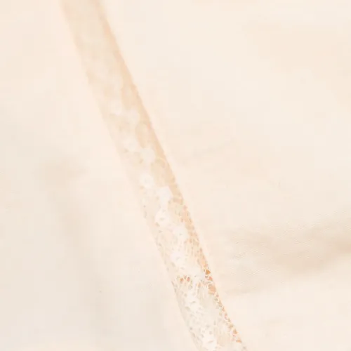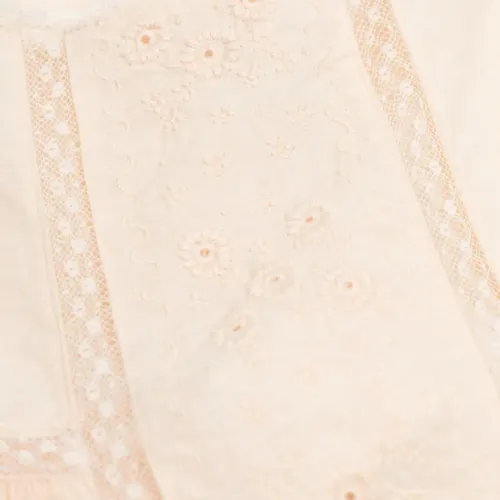 светло-персиковая кружевная отделка с цветочной вышивкой, короткие рукава, застежка на пуговицы
