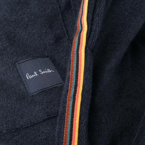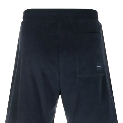 Темно-синий, смесовый хлопок, полотенечная ткань, принт Artist Stripe, нашивка с логотипом сбоку, средняя посадка, нашивка с логотипом сзади, длина по колено, два прорезных кармана по бокам, накладной карман сзади и кулиска на талии.